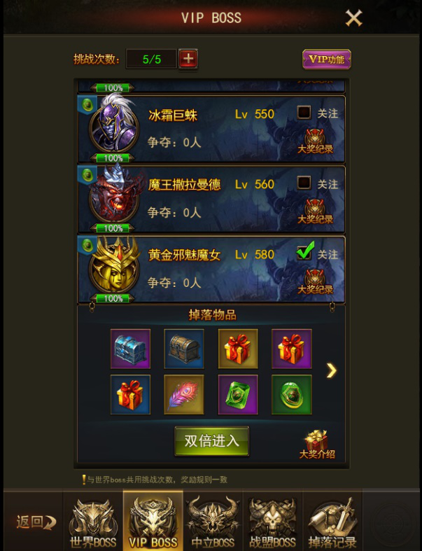 注意:跨服BOSS和中立BOSS共享同一个疲劳值。